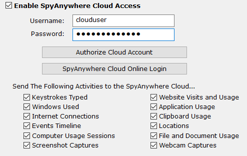 To setup the cloud service click on "Remote Log Viewing" on the bottom of the SpyAgent interface. Enter your cloud username and password into the account settings, then click 'Authorize Cloud Account' to initialize your cloud account.